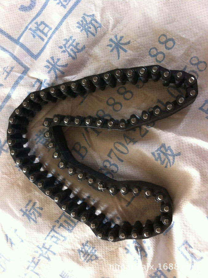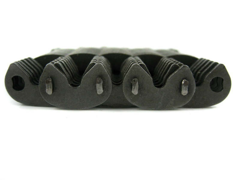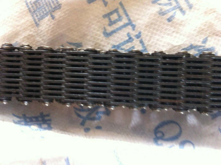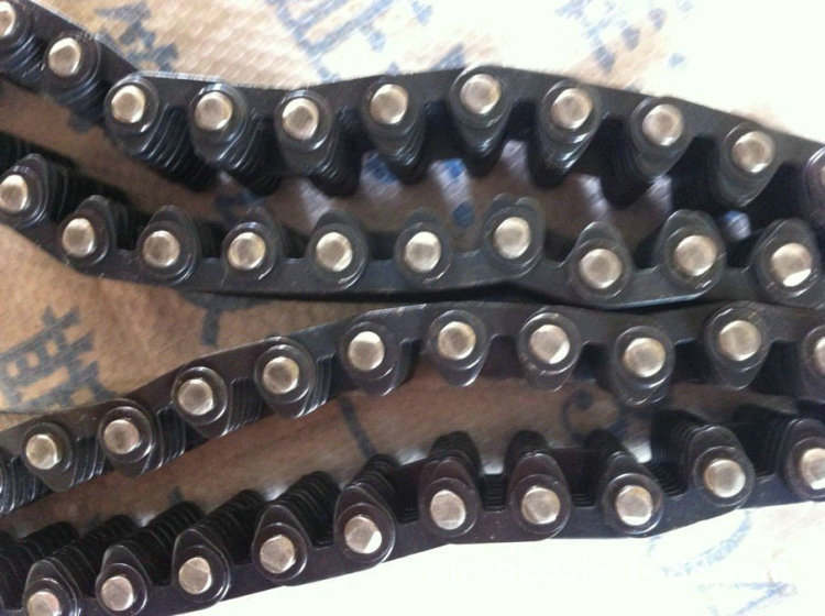 齒形鏈條簡介:也叫無聲鏈,傳動鏈條,齒型鏈條,英文Silent chain,屬于傳動鏈條的一種形式。我國的國家標(biāo)準(zhǔn):GB/TB10855-2003《齒形鏈和鏈輪》。齒形鏈?zhǔn)怯梢幌盗械凝X鏈板和導(dǎo)板交替裝配且銷軸或組合的鉸接原件連接而成。根據(jù)導(dǎo)向形式可分為:外導(dǎo)齒形鏈,內(nèi)導(dǎo)齒形鏈或雙內(nèi)導(dǎo)齒形鏈。