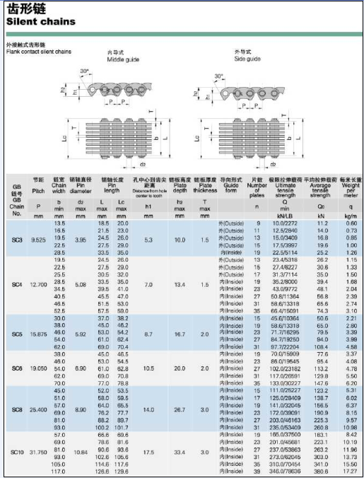 CL08-CL20齒形鏈條,sc3-sc10無聲鏈條:無聲鏈條,一種傳動鏈條。齒形鏈條是一種無音鏈條,傳動精度高,齒形鏈條無噪音,齒形鏈條傳動速度高,齒形鏈條節(jié)距從9.525毫米到31.75毫米,齒形鏈條腰部弧形,跟直行的SC4齒形鏈條不一樣。