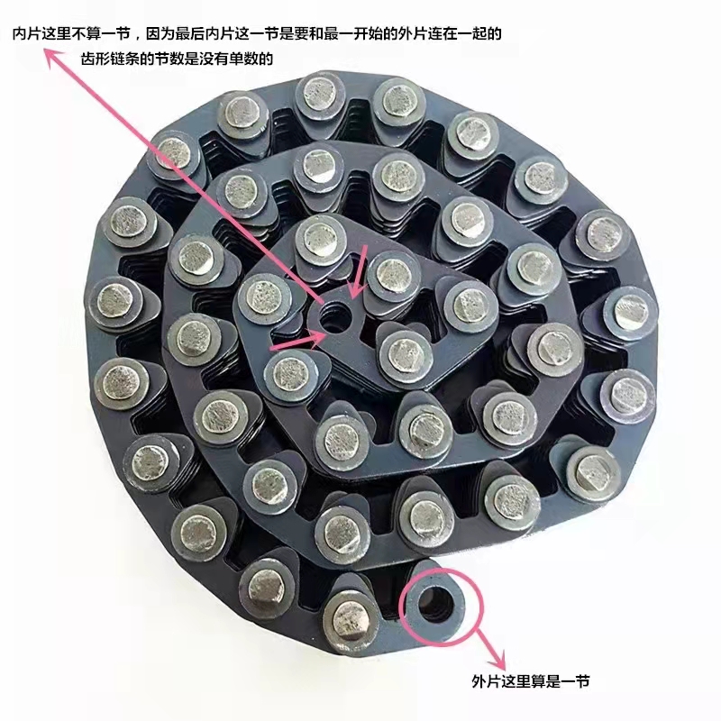 加鏈片排數(shù))。齒形鏈?zhǔn)且环N應(yīng)用廣泛的重要機(jī)械基礎(chǔ)件,主要用在高速、重載、低噪音、大中心距的工況下,其傳動(dòng)性能優(yōu)于齒形帶傳動(dòng)、齒輪傳動(dòng)以及滾子傳動(dòng),以成為眾多行業(yè)對傳動(dòng)形式之一,以嚙合形式分可分為內(nèi)嚙合齒形鏈、外嚙合齒形鏈和內(nèi)外復(fù)合嚙合齒形鏈,其中內(nèi)外復(fù)合嚙合齒形鏈的噪音最小,應(yīng)用也最廣泛