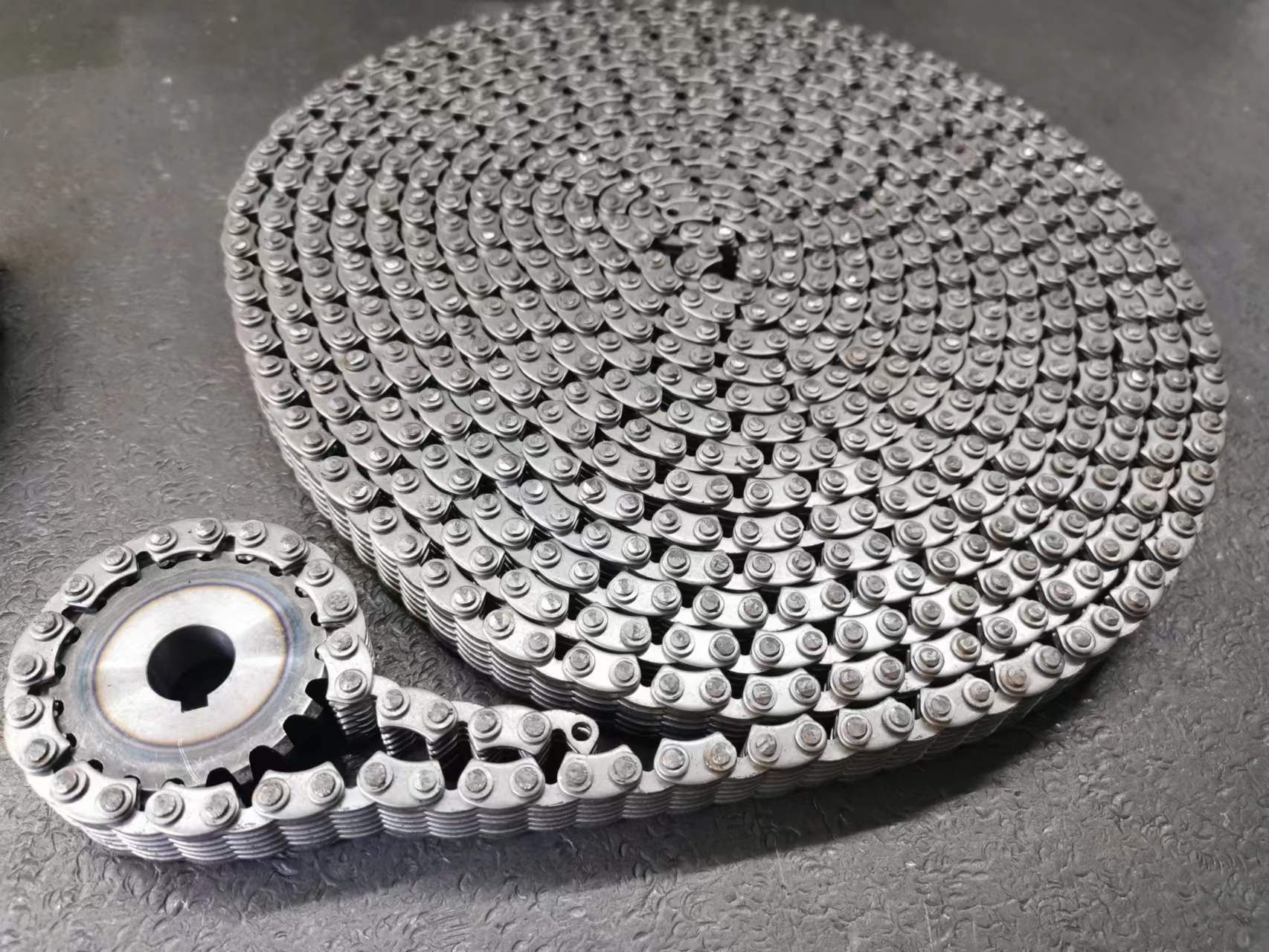 齒形鏈又稱無聲鏈(Silent Chain),屬于傳動(dòng)鏈的一種形式。我國(guó)的國(guó)家標(biāo)準(zhǔn)為:GB/T10855-2003《齒形鏈和鏈輪》。齒形鏈?zhǔn)怯梢幌盗械凝X鏈板和導(dǎo)板交替裝配且銷軸或組合的鉸接元件連接組成,相鄰節(jié)距間為鉸連節(jié)。根據(jù)導(dǎo)向型式可分為:外導(dǎo)式齒形鏈、內(nèi)導(dǎo)式齒形鏈和雙內(nèi)導(dǎo)齒形鏈.齒形鏈又稱無聲鏈,屬于傳動(dòng)鏈的一種形式。齒形鏈?zhǔn)且环N應(yīng)用廣泛的重要機(jī)械基礎(chǔ)件,主要用在高速、重載、低噪音、大中心距的工況下,其傳動(dòng)性能優(yōu)于齒形帶傳動(dòng)、齒輪傳動(dòng)以及磙子鏈傳動(dòng),以成為眾多行業(yè)對(duì)傳動(dòng)形式之一,以嚙合形式分可分為內(nèi)嚙合齒形鏈、外嚙合齒形鏈和內(nèi)外復(fù)合嚙合齒形鏈,其中內(nèi)外復(fù)合嚙合齒形鏈的噪音小,應(yīng)用也廣泛。主要特點(diǎn):1.噪音小 齒形鏈?zhǔn)峭ㄟ^工作鏈板與鏈輪齒的漸開線齒形進(jìn)行嚙合傳遞動(dòng)力,與滾子鏈和套筒鏈相比其多邊形效應(yīng)明顯降低,沖擊小、運(yùn)動(dòng)平穩(wěn)、嚙合噪音較小。2.可靠性較高 齒形鏈的鏈節(jié)是多片式結(jié)構(gòu),當(dāng)其中個(gè)別鏈片在工作中遭到破壞時(shí)并不影響整根鏈條的工作,使人們能夠及時(shí)發(fā)現(xiàn)并更換,如需增加承載能力只需在寬度方向較小尺寸(增加鏈片排數(shù))。3.運(yùn)動(dòng)精度高 齒形鏈各鏈節(jié)磨損伸長(zhǎng)均勻,可保持較高的運(yùn)動(dòng)精度。齒形鏈條主要應(yīng)用范圍:齒形鏈主要應(yīng)用在紡織機(jī)械和無心磨床,傳送帶機(jī)械設(shè)備。齒形鏈條的種類:CL06,CL08,CL10,CL12,CL16,CL20。根據(jù)導(dǎo)向分:內(nèi)導(dǎo)的齒形鏈條和外導(dǎo)的齒形鏈條,內(nèi)外復(fù)合的齒形鏈條