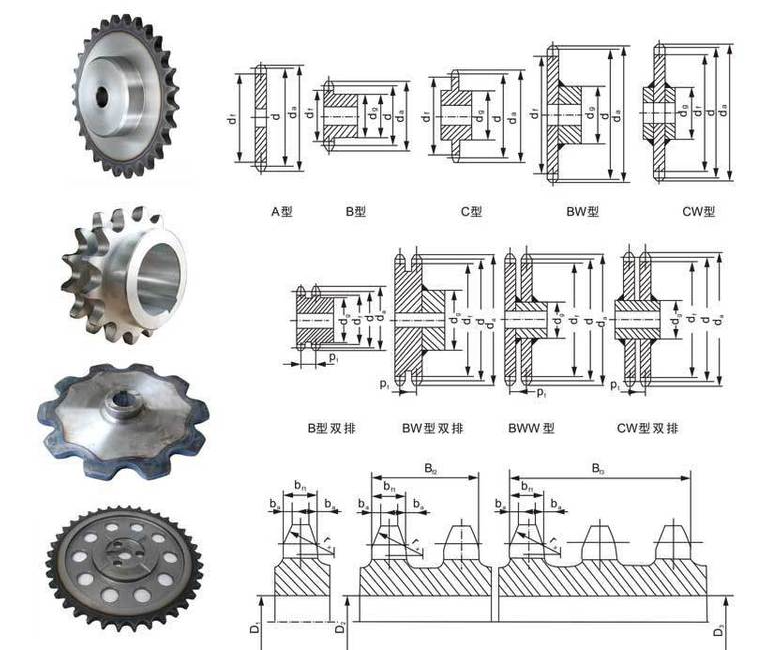 鏈輪軸面齒形兩側(cè)呈圓弧狀,以便于鏈節(jié)進入和退出嚙合。齒形用標準刀具加工時,在鏈輪工作圖上不必繪制端面齒形,但須繪出鏈輪軸面齒形,以便車削鏈輪毛壞。軸面齒形的具體尺寸見有關(guān)設(shè)計手冊。鏈輪齒應(yīng)有足夠的接觸強度和耐磨性,故齒面多經(jīng)熱處理。小鏈輪的嚙合次數(shù)比大鏈輪多,所受沖擊力也大,故所用材料一般應(yīng)優(yōu)于大鏈輪。常用的鏈輪材料有碳素鋼(如Q235、Q275、45、ZG310-570等)、灰鑄鐵(如HT200)等。重要的鏈輪可采用合金鋼。小直徑鏈輪可制成實心式;中等直徑的鏈輪可制成孔板式;直徑較大的鏈輪可設(shè)計成組合式,若輪齒因磨損而失效,可更換齒圈。