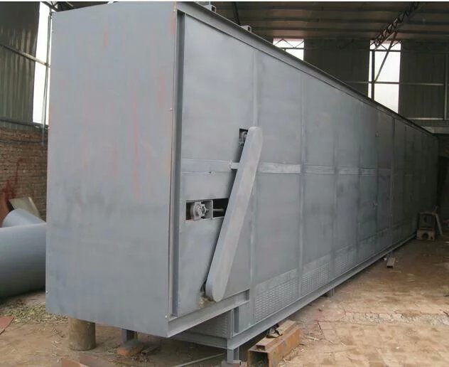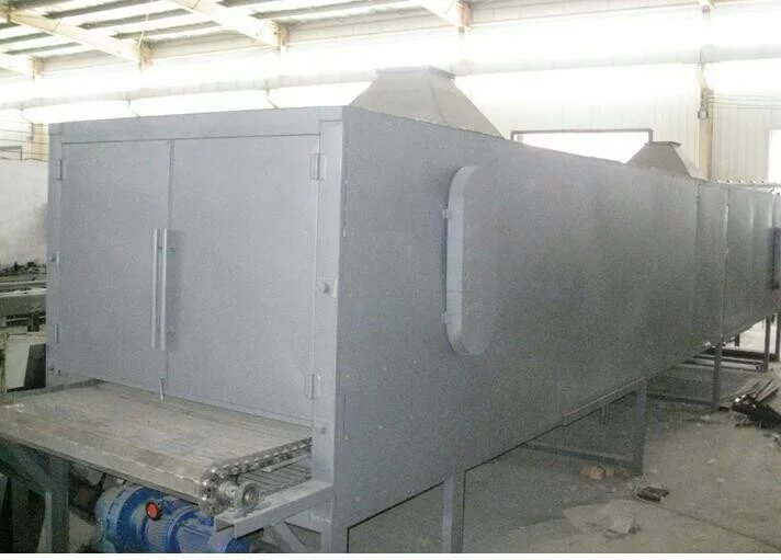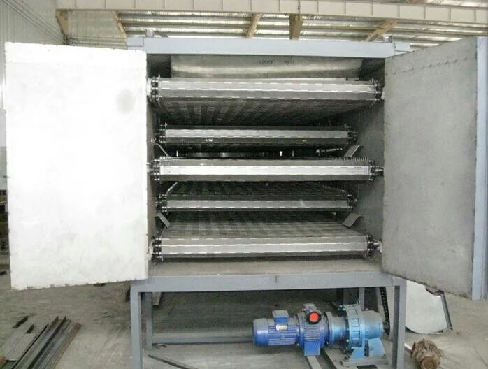 網(wǎng)帶式烘干機(jī)將所要處理的物料通過(guò)適當(dāng)?shù)匿伭蠙C(jī)構(gòu),如星型布料器,擺動(dòng)帶,粉碎機(jī)或造粒機(jī),分布在輸送帶上,輸送帶通過(guò)一個(gè)或者幾個(gè)加熱單元組成的通道,每個(gè)加熱單元均配有加熱和循環(huán)系統(tǒng),每一個(gè)通道有一個(gè)或幾個(gè)排濕系統(tǒng),在輸送帶通過(guò)時(shí),熱空氣從下往上通過(guò)輸送帶上的物料,從而使得物料均勻干燥。基本工作原理是需要烘干的物料通過(guò)提升機(jī)提升到高處,物料北布料器,均勻的分布在烘干機(jī)最上面的一層輸送帶上,輸送帶把物料從機(jī)尾輸送到機(jī)頭,然后物料滑落到第二層,物料從機(jī)頭又被輸送到機(jī)尾,物料又滑落到第三層,物料從機(jī)尾再次被輸送到機(jī)頭,如此反復(fù)的輸送,物料在被輸送的同時(shí)進(jìn)行熱風(fēng)烘干,物料最后被最下面的一層不銹鋼網(wǎng)帶輸送出烘干機(jī),這時(shí)物料被烘干到客戶需要的程度。然后進(jìn)行輸送降溫或者立即裝袋處理。網(wǎng)帶烘干機(jī)是一種連續(xù)的,批量生產(chǎn)的帶式干燥設(shè)備,主要有電加熱,燃煤加熱,蒸汽加熱,導(dǎo)熱油加熱,燃天然氣加熱,熱風(fēng)加熱等等。其主要原理是將物料均勻的平鋪在網(wǎng)帶上,網(wǎng)帶采用12-60目的鋼絲網(wǎng)帶,由傳動(dòng)裝置拖動(dòng)在干燥機(jī)內(nèi)往復(fù)運(yùn)行,熱風(fēng)在物料間穿流而過(guò),水蒸氣從排濕孔中排出,從而達(dá)到干燥的目的,箱體長(zhǎng)度有標(biāo)準(zhǔn)段組合而成,為了節(jié)約場(chǎng)地,可將烘干機(jī)分成多層式,常見(jiàn)的有二室三層,二室五層,長(zhǎng)度4-60米,有效寬帶0.6-3.0米。網(wǎng)帶烘干機(jī)由保溫隧道,網(wǎng)帶,傳動(dòng)裝置,進(jìn)風(fēng)出風(fēng)管道,加熱源,鼓風(fēng)機(jī),排濕風(fēng)機(jī)等。網(wǎng)帶的線速視物料的種類和含水量而定。風(fēng)流向采用負(fù)壓,多孔進(jìn)風(fēng)保證烘干面積,風(fēng)流風(fēng)速分布均勻,提高烘干效果。要想得到最佳的烘干效果和合適的產(chǎn)量,物料的含水量和網(wǎng)帶的線速度,風(fēng)流量和風(fēng)溫,都得必須適當(dāng),合理,有機(jī)結(jié)合。