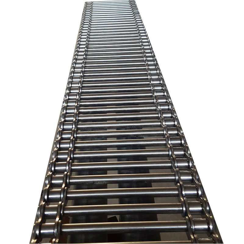 這是一種利用鏈條和支軸做成的傳送輸送帶。先把支軸穿軸的兩頭車細(xì),然后兩邊鑲上鏈條,最后用墊圈把支軸焊上或用開口銷銷上,這就是鏈桿式輸送帶。鏈條的節(jié)距和材質(zhì)和滾子的大小各種都有,支軸的粗細(xì)和材質(zhì)和直徑和長度有多種型號供選擇。