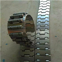鏈板網(wǎng)帶非常堅(jiān)固,由不銹鋼鏈條驅(qū)動(dòng),采用不銹鋼板材生產(chǎn),適合用于輸送細(xì)小的高密度物件,輸送過(guò)程中運(yùn)轉(zhuǎn)平穩(wěn),安裝更換方便,使用壽命較長(zhǎng)。用于中等和大負(fù)荷輸送。鋼板彎曲形成合葉,使用支軸將合葉和鏈條串在一起。兩端的鏈條可以使用開(kāi)口銷(xiāo)或者墊圈來(lái)固定,使用開(kāi)口銷(xiāo)方便拆卸,維護(hù)方便。鏈板大概分:1,按照材質(zhì)分:碳鋼鏈板輸送帶,鍍鋅鏈板輸送帶,不銹鋼201鏈板輸送帶,不銹鋼304鏈板輸送帶,其他不銹鋼鏈板輸送帶。2,根據(jù)外形來(lái)分:平鏈板輸送帶,帶橫擋板鏈板輸送帶,帶擋邊鏈板輸送帶,沖孔鏈板輸送帶(圓孔,長(zhǎng)條孔),帶凸起鏈板輸送帶。3,根據(jù)輸送形式分:直輸鏈板輸送帶,拐彎的鏈板輸送帶。4,合頁(yè)鏈板輸送帶,排屑鏈板輸送帶,槽鋼鏈板輸送帶。5,雙節(jié)距鏈條鏈板帶,精密滾子鏈條鏈板輸送帶。