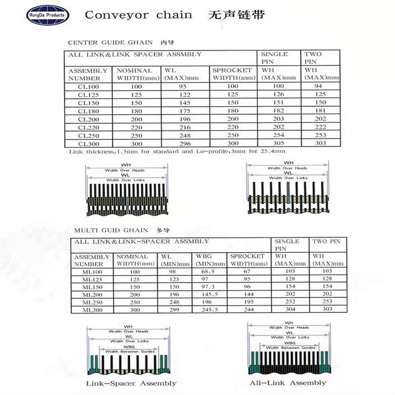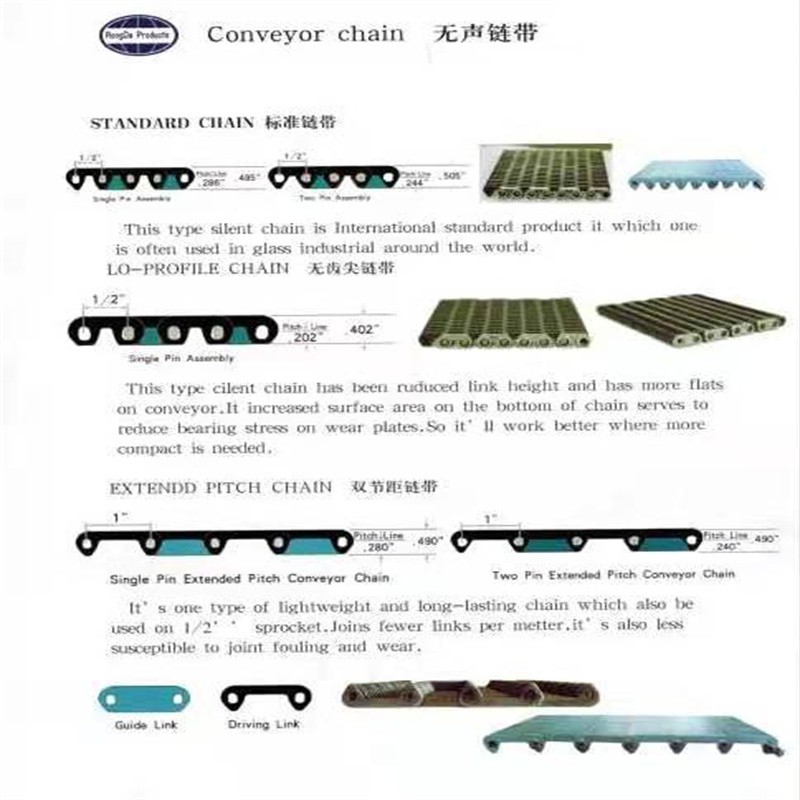 1.無聲齒形鏈帶:一種金屬輸送帶,采用鏈條片和銷軸于墊圈做成的輸送用傳送帶,外形寬度非標定做也有好多規(guī)格的現(xiàn)貨,鏈帶是用在玻璃廠輸送玻璃瓶罐器皿日用玻璃器皿的,也有的時候用在其他的輸送機械上,用來輸送其他產(chǎn)品,無聲齒形鏈帶的優(yōu)點就是平整,輸送面平穩(wěn),輸送高腳杯,不會倒瓶,無聲齒形鏈帶用來輸送高溫玻璃制品,用于玻璃機械行列式制瓶機上,橫向輸瓶機,我們現(xiàn)在還研發(fā)了轉(zhuǎn)彎的拐彎的無聲齒形鏈帶,用于縱向拐彎橫向結(jié)合的輸送機上。無聲齒形鏈帶材質(zhì)有碳鋼的 錳鋼的 合金鋼的 ,節(jié)距有12.7毫米 25.4毫米 單軸的和雙軸的,無齒形鏈帶從外形看有內(nèi)導向和外導向,無聲齒形鏈帶有帶保護帽的和不帶保護帽的,無聲齒形鏈帶有帶尖的和不帶尖的。寬度125毫米 150毫米 200毫米 300毫米 常年有現(xiàn)貨 當天下單當天發(fā)貨 配套的無聲齒形鏈輪有現(xiàn)貨 英文名稱Silent tooth chain ,顏色有發(fā)黑的有本色的。常規(guī)的是5米一件 五米一木箱 ,用于輸送機上一般是每分鐘15米左右